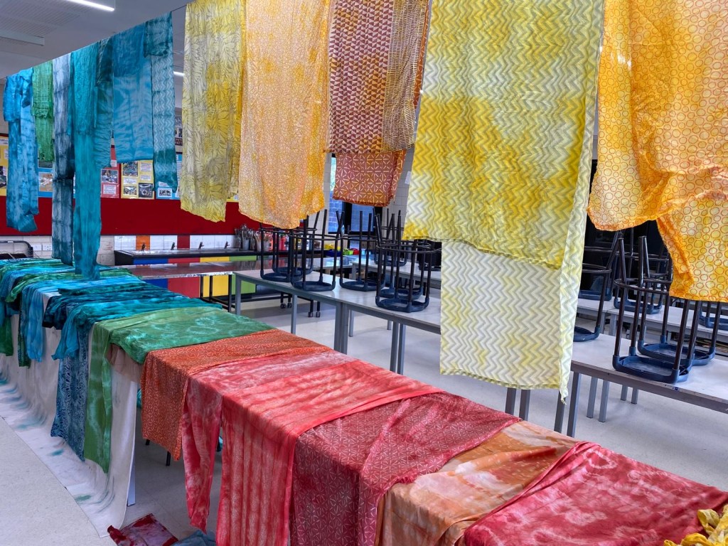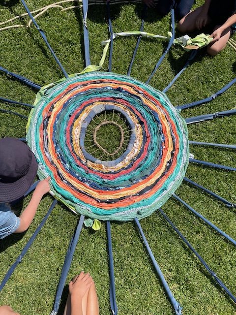 Our artwork with the children celebrates the connection of all the living things at Darch Brook and the fragile web that sustains life there. We wanted to help them recognise that all these creatures no matter how small play an important part in maintaining a healthy ecosystem. We worked in a circle with each child holding a thread of the weave. One by one, each child spoke their name whilst weaving the hand dyed and recycled fabric into the artwork. We then talked about the different animals that lived in and around the brook, what the children liked to do at the brook and symbolically wove those thoughts into the artwork. The children needed to all work together, to communicate, listen, be patient and act respectfully, so that together we could grow and weave our artwork to reflect the beauty of Darch Brook.