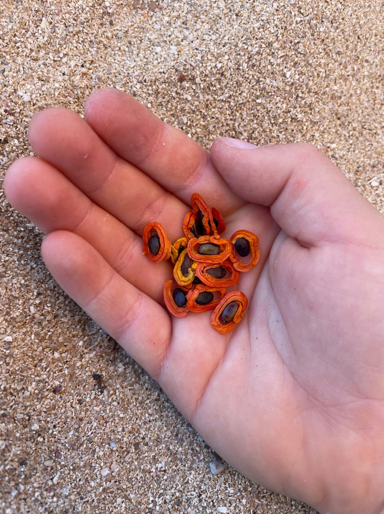 When we met up with the koolunga (children) from Cowaramup Primary School and Nature Conservation for the cultural session at Cowaramup Bay, we were greeted by Wayne Webb and the Undalup rangers and we were absolutely mesmerised by the stories of the whales and the knowledge that they shared. The rangers pointed out the seed pods of the Acacia Cyclops growing close to the main beach and explained how when these pods dry and open they look just like a whale’s eye (mamang meela). Wayne continued to speak about how the whales today are traveling along the old songlines of the Wardandi people. Visiting campsites which used to exist when the land stretched further out to sea and tasting water from the underwater creeks and rivers that flow from the land (like the little creek that runs out from the bay). He continued to explain that when the seed pods of the ‘Mamang Meela’ dry and open, this is the time to look to the ocean and see the whales migrating past Cowaramup Bay.