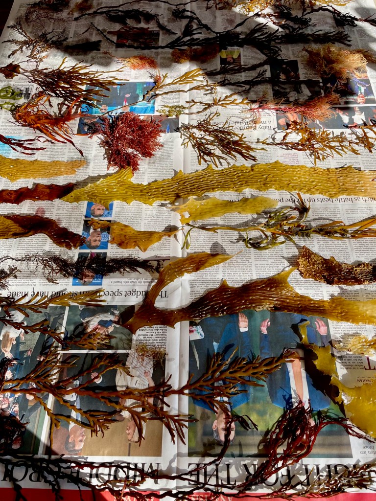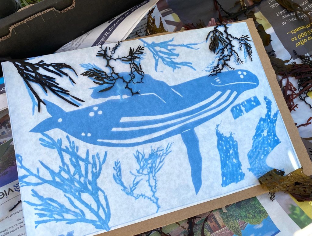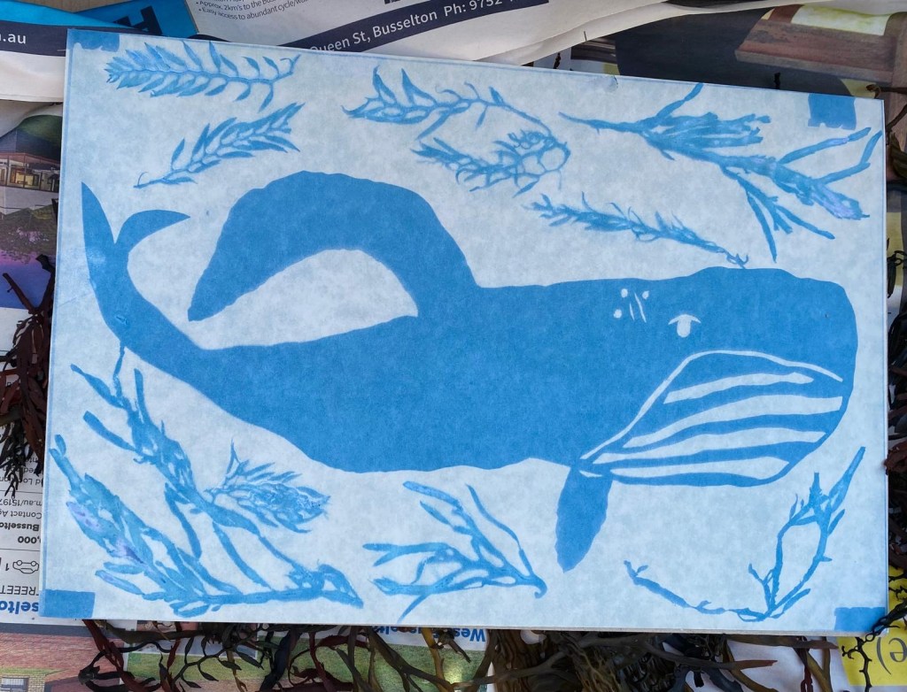 Cyanotype Prints with whale stencils and seaweeds from Cowaramup Bay.
