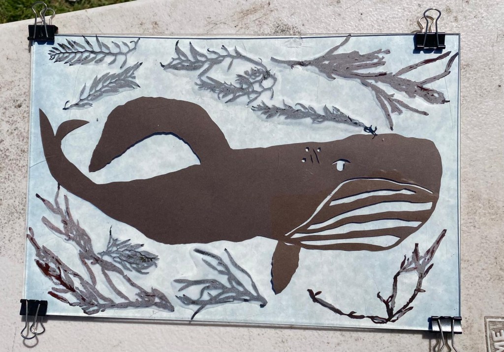 After this session we knew that our artwork needed to focus on the whales. Using real images of Humpback whales as inspiration, we invited the children to draw their own individual whale. These whales were cut into stencils and used to create their cyanotype sun print. The cyanotype technique uses the UV light of the sun to create a print onto a specialised light sensitive paper. For this artwork, the children used seaweed collected from Cowaramup Bay to help add to the textures and scene for the migration of whales.