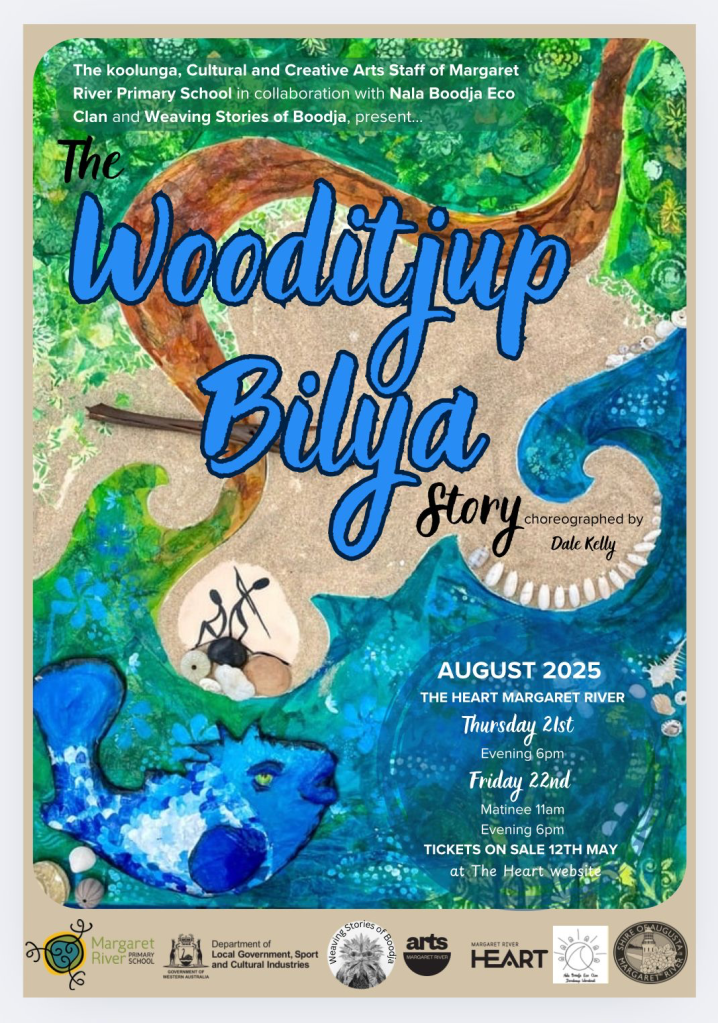 Weaving Stories of Boodja is collaborating with Margaret River Primary School to bring to life the Wardandi dreaming story of The Wooditjup Bilya – the Margaret River. Under the cultural guidance of Wardandi Matriarch Vivian Brockman Webb and Wardandi Custodian Mitchella Hutchins the koolunga of Margaret River are working hard on the performance, helping create costume, puppets, set and props. The story entrusted to us will be shared through a captivating blend of traditional and contemporary dance, movement, puppetry, music and storytelling.