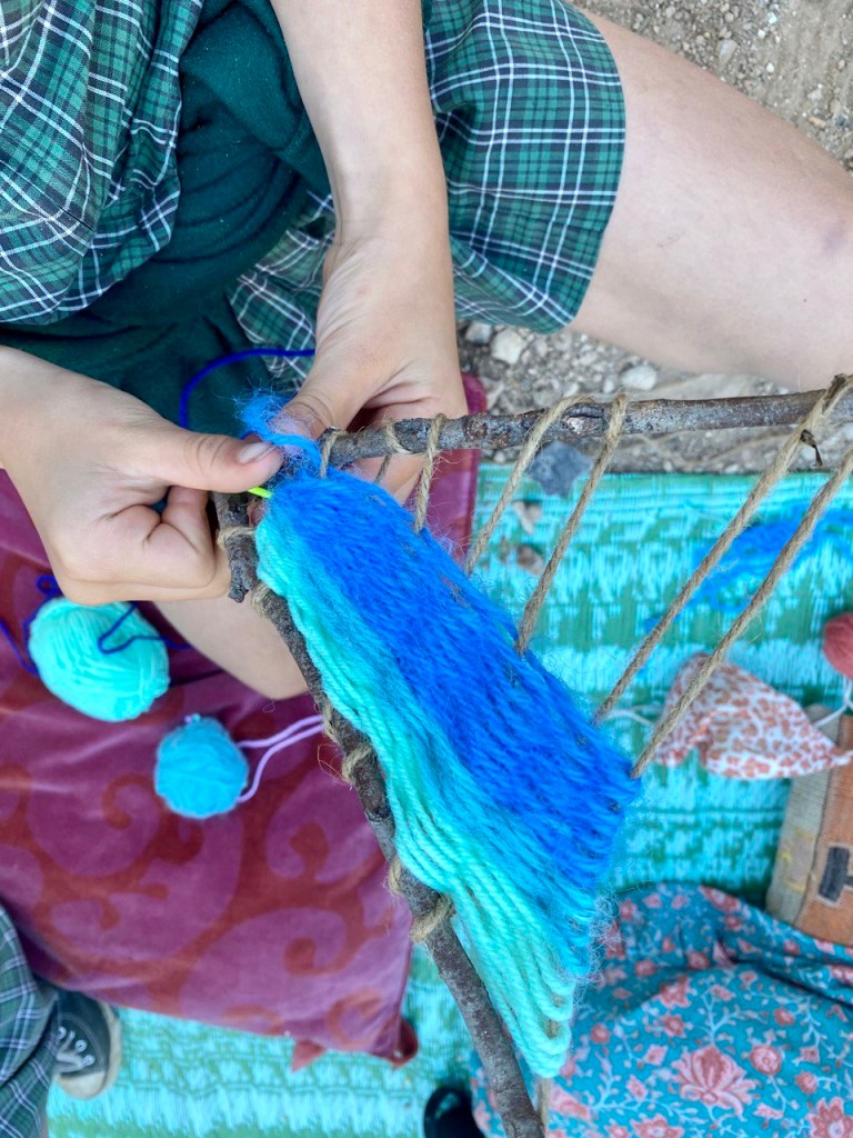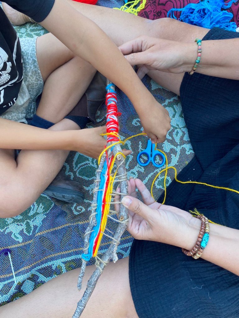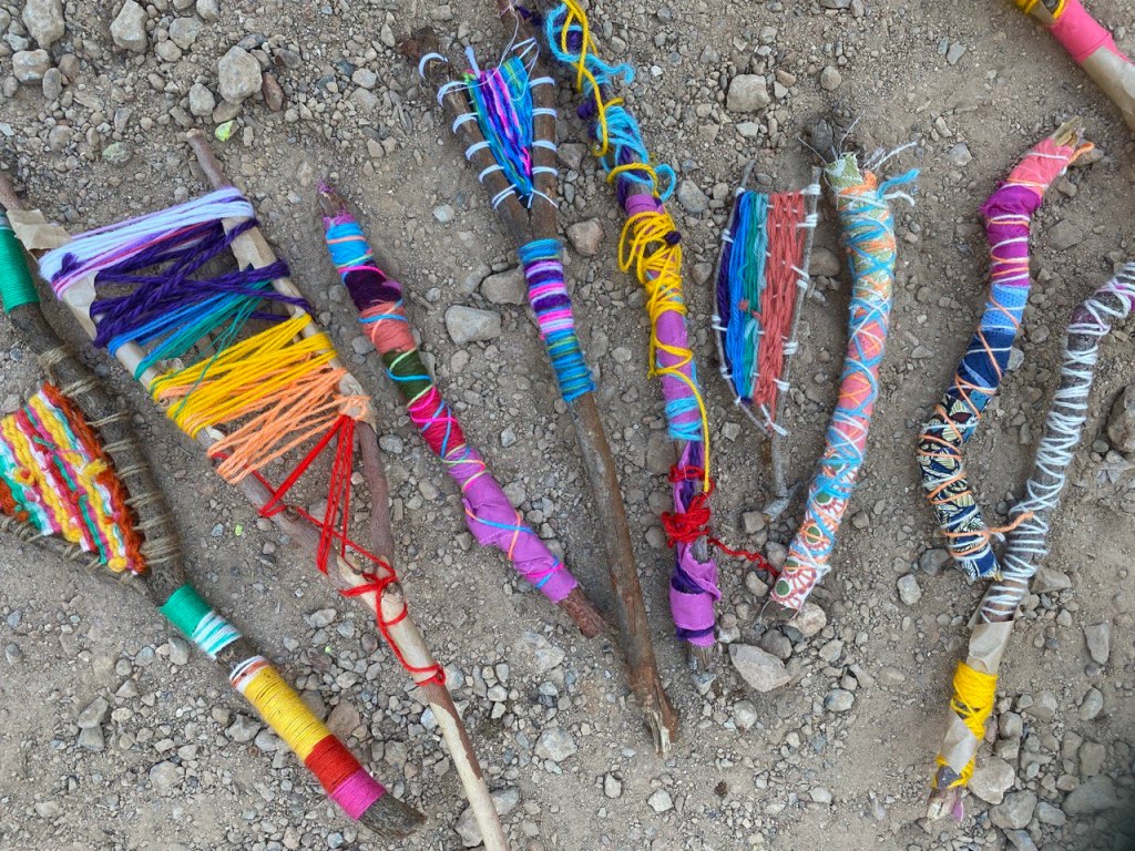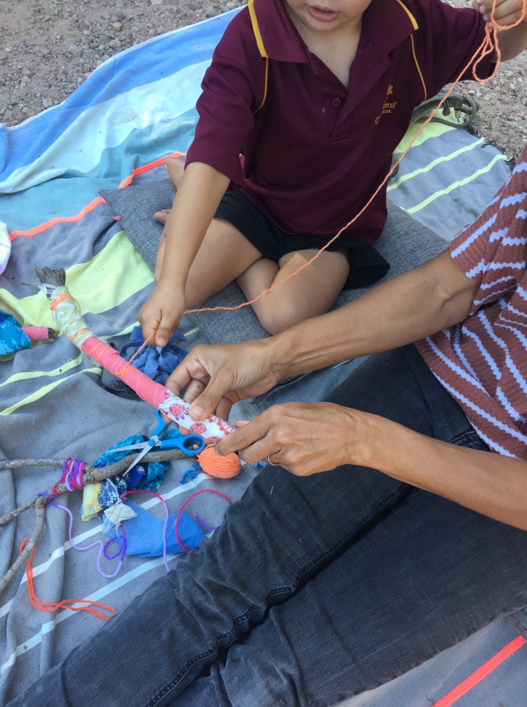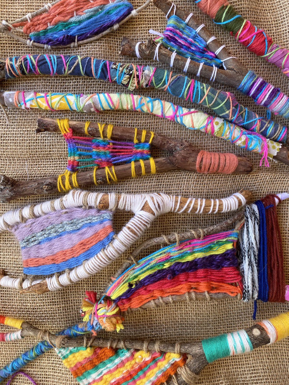 Brows furrowed in concentration. Hands working together wrapping, tying, weaving. Transforming and accentuating the organic forms and lines of nature. Scraps of colourful fabric and yarn fall away.