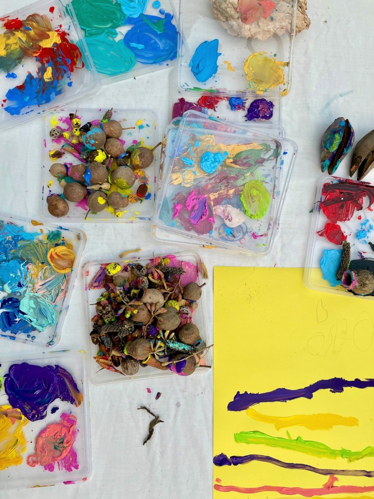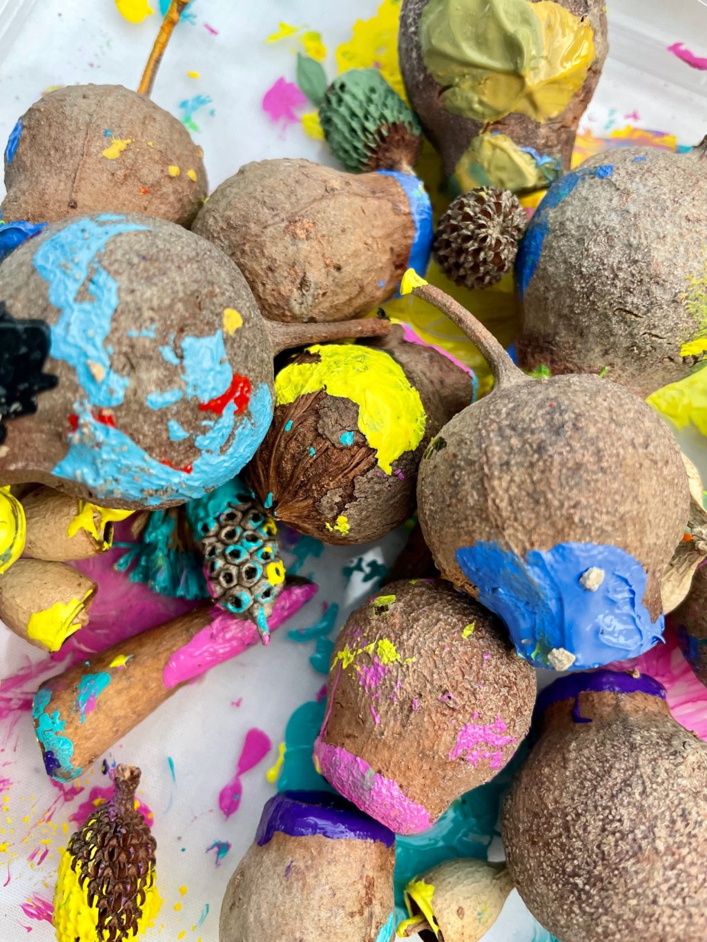 Then a slight air of anxiety crept in from the parents, with the anticipation of paint + kids = MESS (good fun creative mess, of course!) as colourful paint pallets were handed out. In a flurry of brush strokes, patterns and imprints of nuts and leaves vibrantly exploded on a sea of paper in every colour of the rainbow.