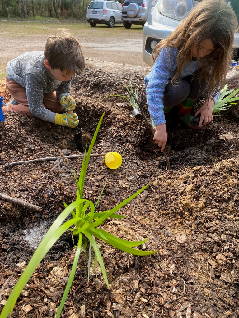 Later that afternoon the rain came back and well and truly gave the plants a water into their new location. We are looking forward to seeing the children visit their plants, tend to the area and make sure that they have water through the dryer months. Fingers crossed the seedlings survive and we can enjoy watching them grow and flower year after year.