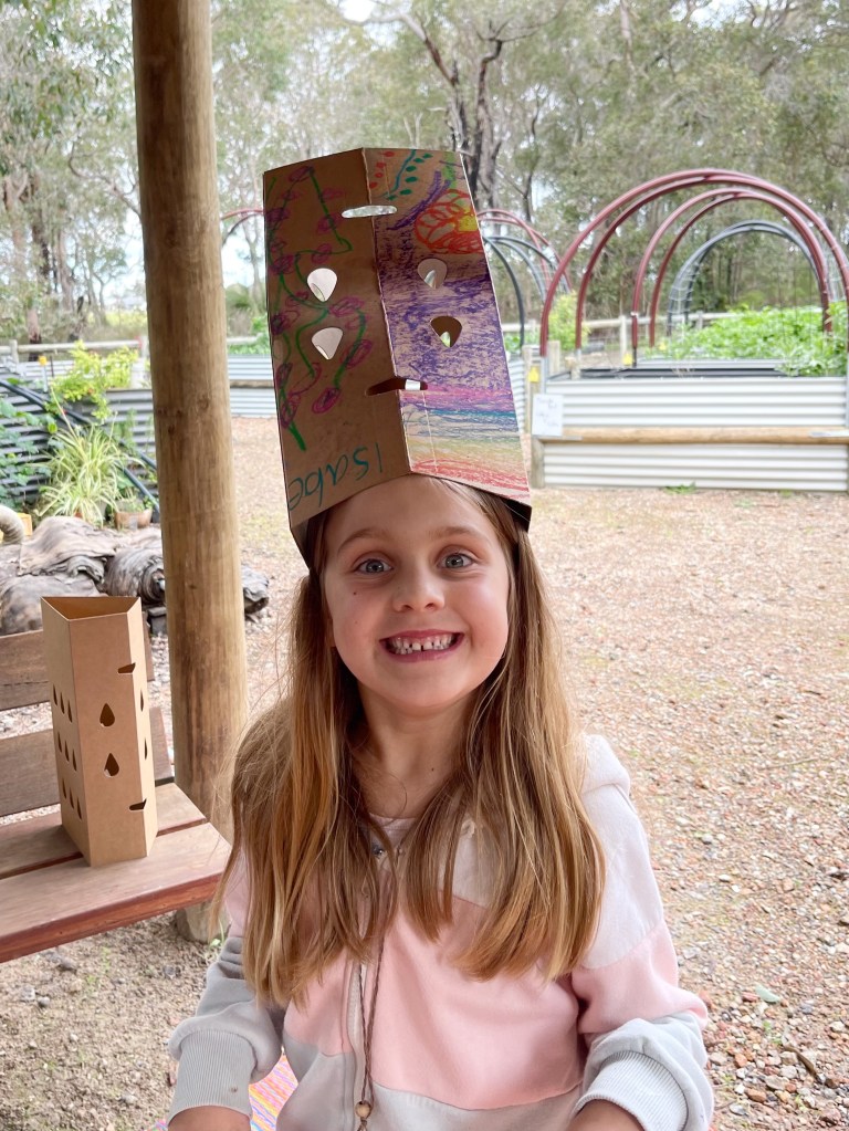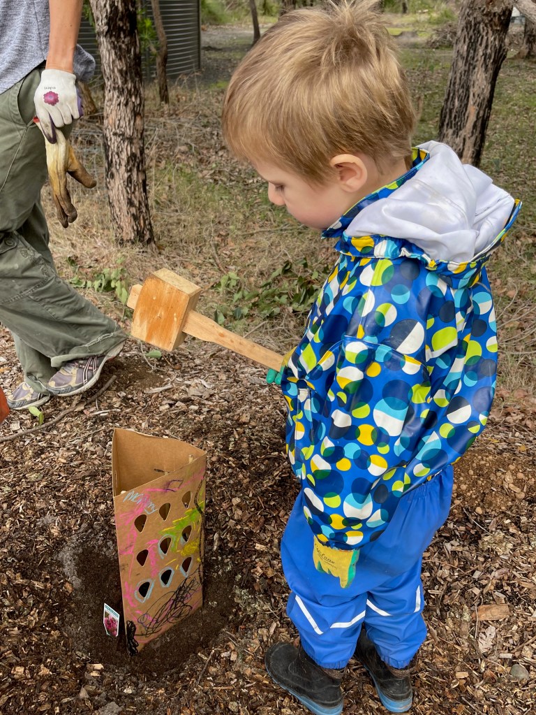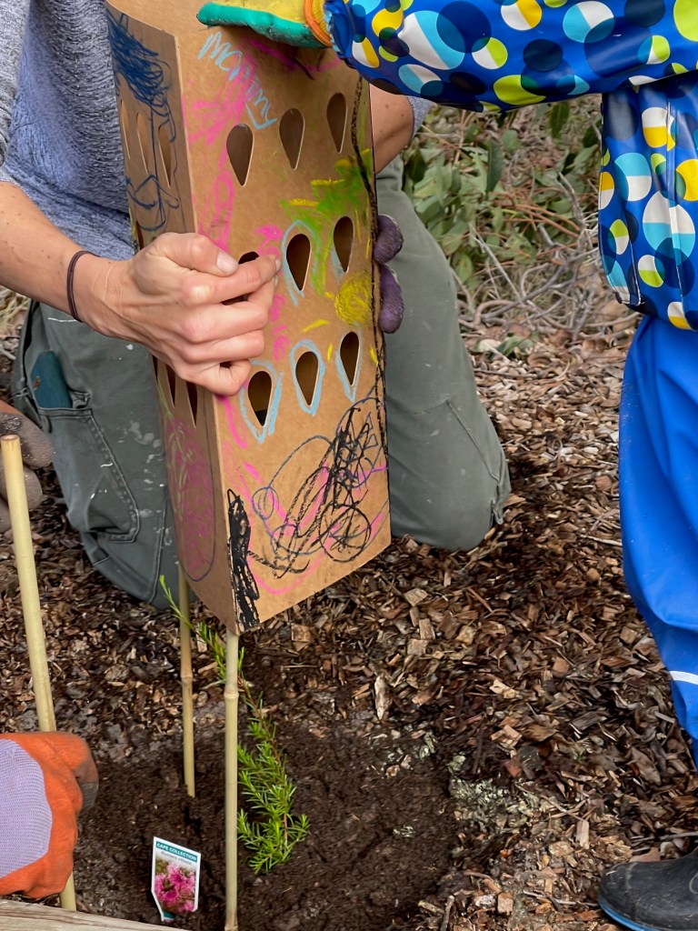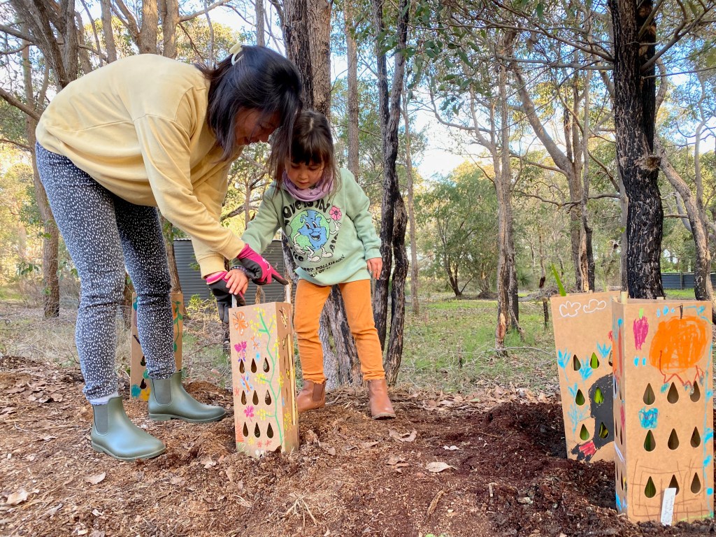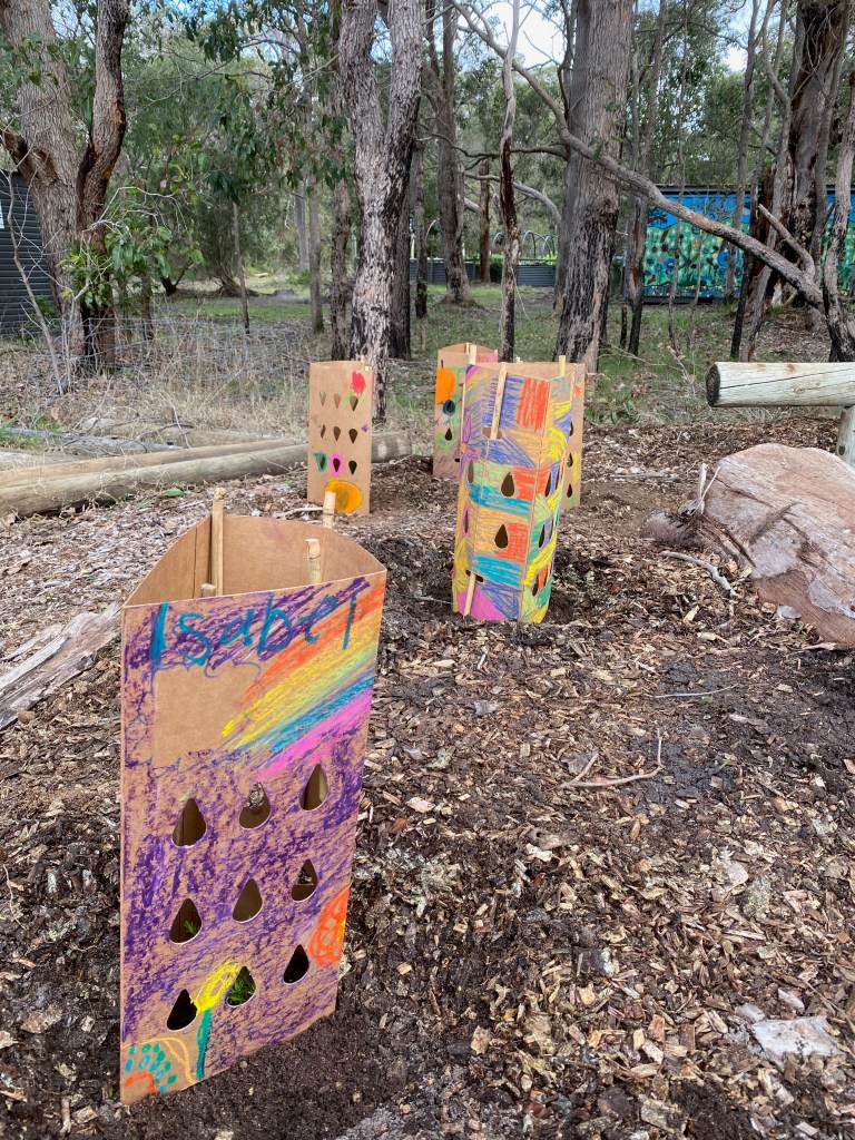 The children & families were invited to decorate their own plant guard which will protect their plant and create a micro-climate to give the seedling the best opportunity to become established and survive the dryer months of Birak in December & January. We saw a rainbow of colour explode onto the cardboard protectors as children enjoyed being able to freely draw their own designs.