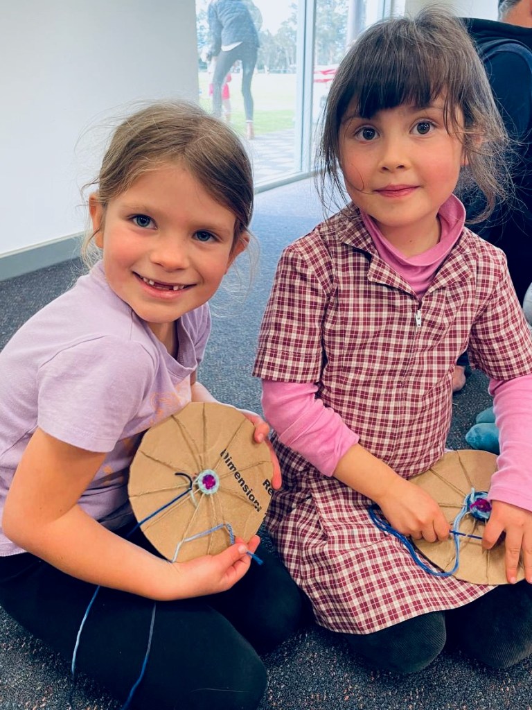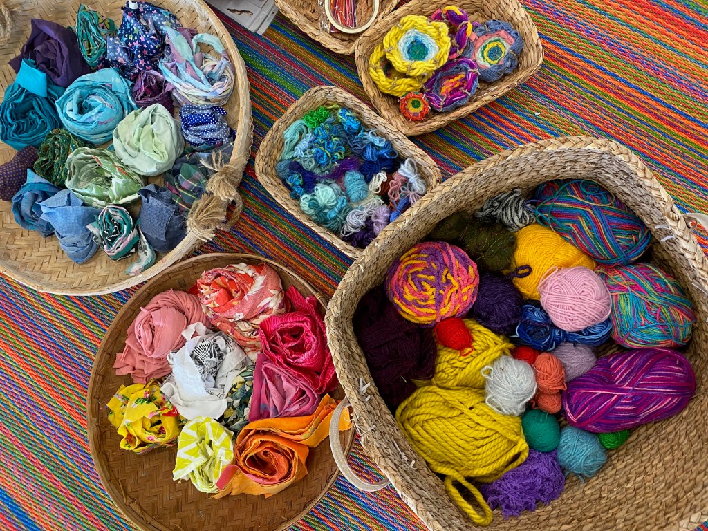 When the families entered the space, they were greeted with our colourful mat centred in the room with balls of yarn and strips of fabric in a plethora of colours. The sounds of native birdsong played in the background drawing them in. The children spotted the samples of the nests they were going to make and like birds, chatted excitedly.