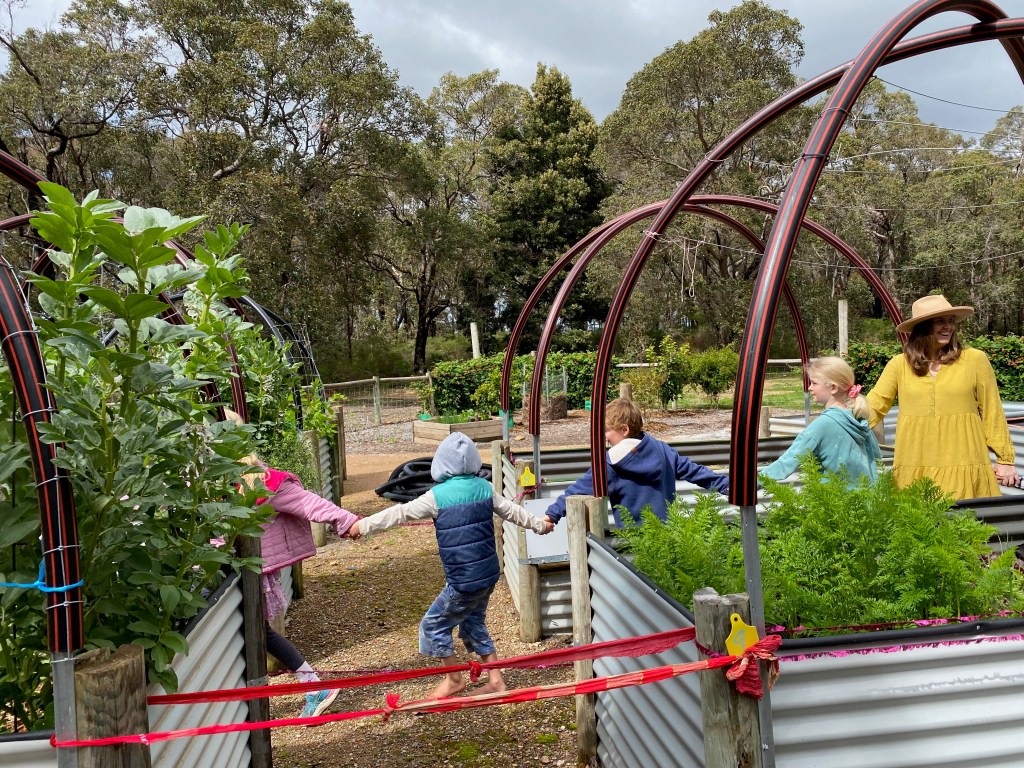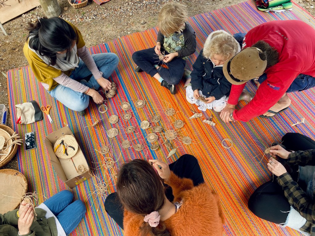 Our workshop with Cynamon began by teaching our bodies how to weave… that’s right, weaving games! This was so much fun! Cynamon played some music, and with their hands held in one long line, the children and families practiced the traditional ‘under & over’ weave, random weaving and coiling by moving their bodies in, out, over and around obstacles in the garden space.