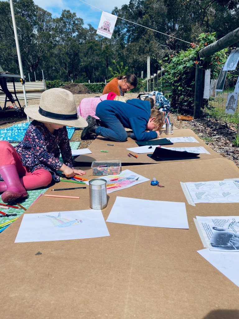 The next stage of the workshop was to actually start weaving and the children took to it like ducks to water! After weaving with their bodies and learning the different methods of weaving from the story they knew exactly what to do. They patiently used a cardboard loom to weave components of the owl wings, they coiled toes for another sculpture of a frog and cut out paperbark feathers to create the feathers of the owls wings and tail. Thank you Cynamon for a fun filled workshop!
